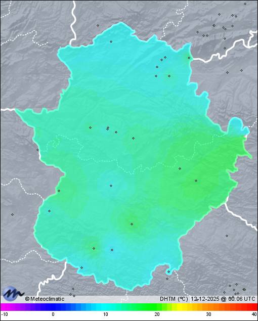 | Actualizado: 11:45 UTC | 10,7°C 95% | 10,8 °C / 96% | | 5,4°C / 95% | | 3 km/h NW | | 11 km/h | | 1.021 hPa | | 0,3 mm |