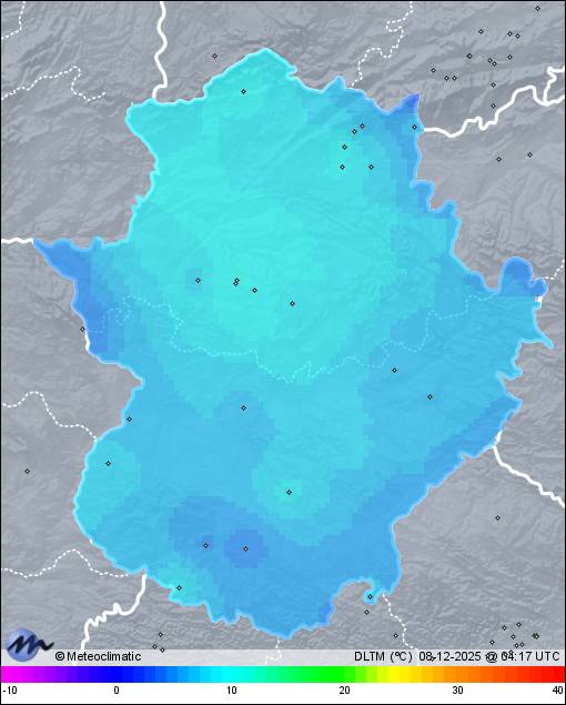 | Actualizado: 09:00 UTC | 9,7°C 85% | 9,7 °C / 90% | | 6,8°C / 82% | | Calma | | 4 km/h | | 1.025 hPa |