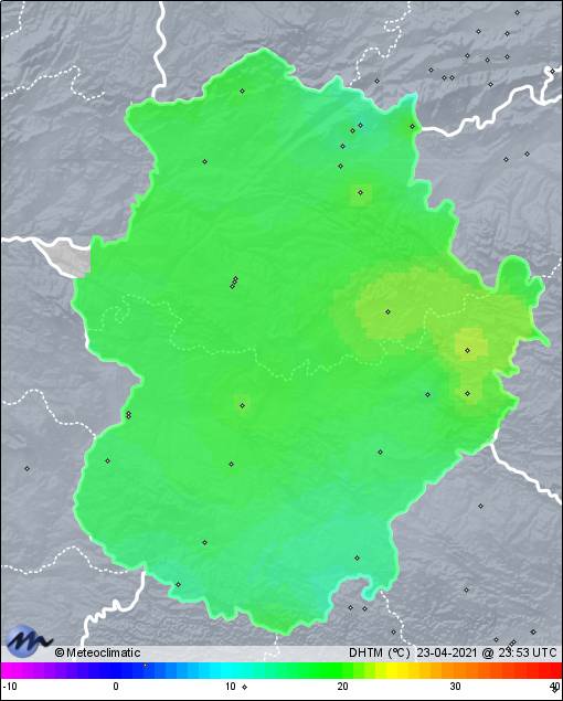 | 23-04-2021 | | | Máx. | Mín. | | | Temperatura | 18,2 | 9,7 | °C | | Humedad | 90 | 56 | % | | Viento | 34 | n/a | km/h | | Presión | 1.019 | 1.015 | hPa | | Precipitación | 0,0 | mm |