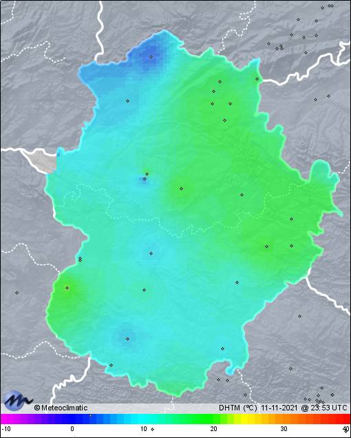 | 11-11-2021 | | | Máx. | Mín. | | | Temperatura | 19,8 | 0,8 | °C | | Humedad | 94 | 41 | % | | Viento | 11 | n/a | km/h | | Presión | 1.021 | 1.018 | hPa | | Precipitación | 0,0 | mm |