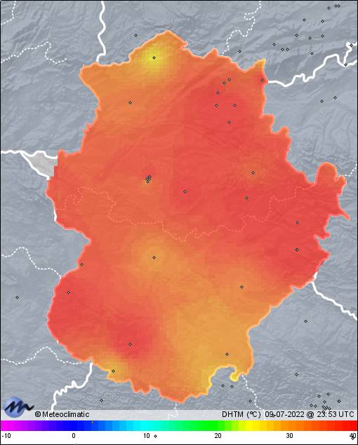 | 09-07-2022 | | | Máx. | Mín. | | | Temperatura | 38,1 | 20,8 | °C | | Humedad | 66 | 19 | % | | Viento | 31 | n/a | km/h | | Presión | 1.020 | 1.017 | hPa | | Precipitación | 0,0 | mm |