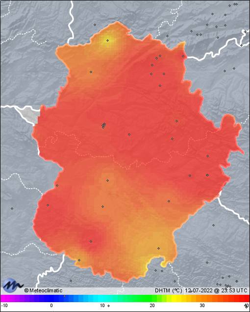 | 12-07-2022 | | | Máx. | Mín. | | | Temperatura | 40,4 | 27,6 | °C | | Humedad | 29 | 11 | % | | Presión | 1.014 | 1.009 | hPa |