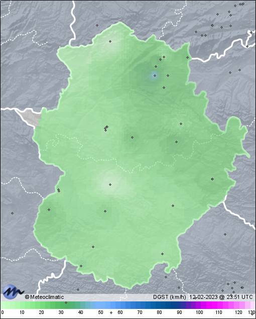 | 12-02-2023 | | | Máx. | Mín. | | | Temperatura | 15,5 | 6,4 | °C | | Humedad | 83 | 57 | % | | Viento | 35 | n/a | km/h | | Presión | 1.029 | 1.027 | hPa | | Precipitación | 0,0 | mm |