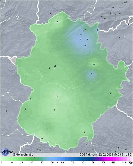 | 23-02-2023 | | | Máx. | Mín. | | | Temperatura | 11,4 | 3,8 | °C | | Humedad | 94 | 34 | % | | Viento | 32 | n/a | km/h | | Presión | 1.016 | 1.010 | hPa | | Precipitación | 0,0 | mm |