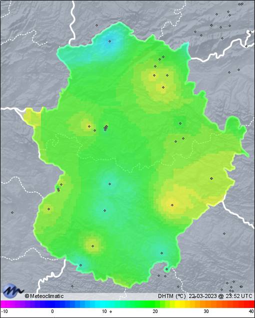 | 22-03-2023 | | | Máx. | Mín. | | | Temperatura | 22,8 | 7,6 | °C | | Humedad | 91 | 26 | % | | Viento | 16 | n/a | km/h | | Presión | 1.018 | 1.015 | hPa | | Precipitación | 0,0 | mm |