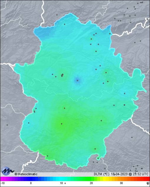 | 18-04-2023 | | | Máx. | Mín. | | | Temperatura | 22,0 | 8,6 | °C | | Humedad | 53 | 31 | % | | Viento | 16 | n/a | km/h | | Presión | 1.015 | 1.007 | hPa |