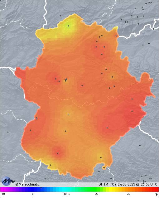 | 27-06-2023 | | | Máx. | Mín. | | | Temperatura | 36,9 | 19,5 | °C | | Humedad | 54 | 19 | % | | Viento | 9 | n/a | km/h | | Presión | 1.013 | 1.007 | hPa | | Precipitación | 0,0 | mm |