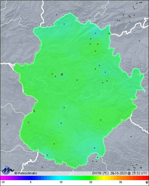 | 28-10-2023 | | | Máx. | Mín. | | | Temperatura | 15,6 | 12,3 | °C | | Humedad | 99 | 85 | % | | Viento | 30 | n/a | km/h | | Presión | 1.011 | 1.007 | hPa | | Precipitación | 22,4 | mm |
