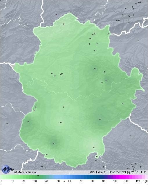 | 15-12-2023 | | | Máx. | Mín. | | | Temperatura | 15,4 | 3,4 | °C | | Humedad | 97 | 54 | % | | Viento | 31 | n/a | km/h | | Presión | 1.032 | 1.027 | hPa | | Precipitación | 0,0 | mm |