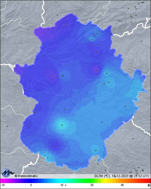| 18-12-2023 | | | Máx. | Mín. | | | Temperatura | 14,5 | -3,5 | °C | | Humedad | 98 | 37 | % | | Viento | 10 | n/a | km/h | | Presión | 1.039 | 1.035 | hPa | | Precipitación | 0,2 | mm |