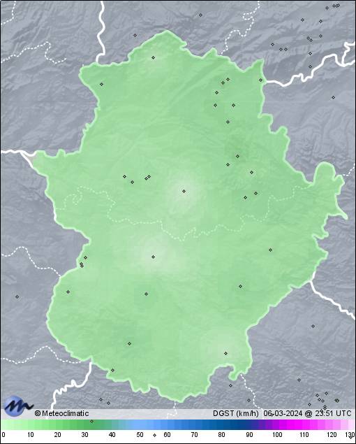 | 06-03-2024 | | | Máx. | Mín. | | | Temperatura | 14,7 | -1,3 | °C | | Humedad | 97 | 48 | % | | Viento | 30 | n/a | km/h | | Presión | 1.025 | 1.014 | hPa | | Precipitación | 0,2 | mm |