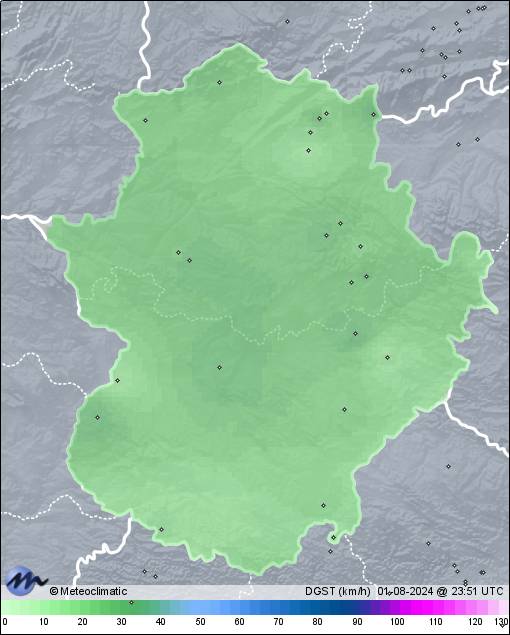 | 01-08-2024 | | | Máx. | Mín. | | | Temperatura | 36,0 | 17,3 | °C | | Humedad | 91 | 20 | % | | Viento | 30 | n/a | km/h | | Presión | 1.017 | 1.013 | hPa | | Precipitación | 0,0 | mm |