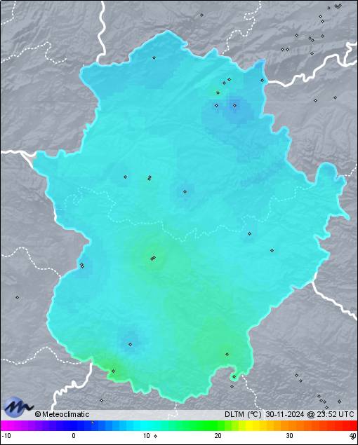 | 30-11-2024 | | | Máx. | Mín. | | | Temperatura | 15,0 | 9,1 | °C | | Humedad | 97 | 86 | % | | Viento | 7 | n/a | km/h | | Presión | 1.029 | 1.027 | hPa | | Precipitación | 0,0 | mm |