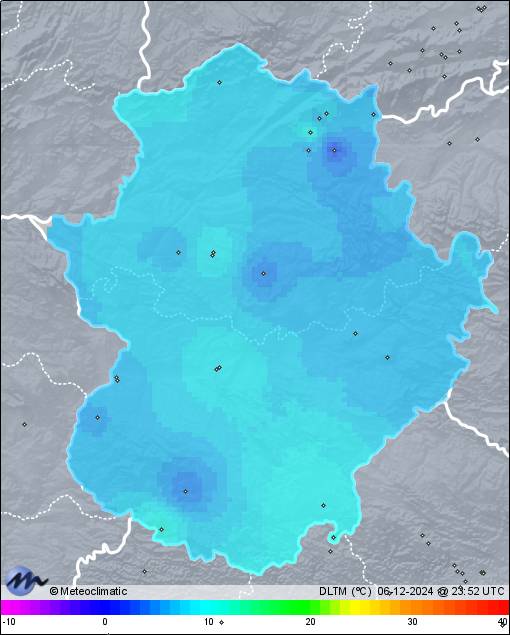 | 06-12-2024 | | | Máx. | Mín. | | | Temperatura | 11,9 | 7,2 | °C | | Humedad | 97 | 96 | % | | Viento | 6 | n/a | km/h | | Presión | 1.034 | 1.030 | hPa | | Precipitación | 0,4 | mm |