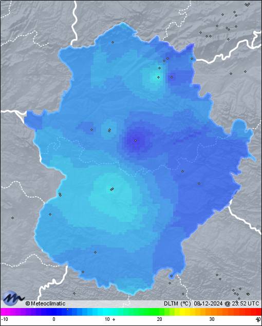 | 08-12-2024 | | | Máx. | Mín. | | | Temperatura | 12,5 | 6,6 | °C | | Humedad | 100 | 50 | % | | Presión | 1.027 | 1.023 | hPa |