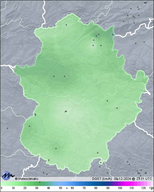 | 09-12-2024 | | | Máx. | Mín. | | | Temperatura | 15,6 | -1,0 | °C | | Humedad | 92 | 34 | % | | Viento | 48 | n/a | km/h | | Presión | 1.023 | 1.019 | hPa | | Precipitación | 0,0 | mm |