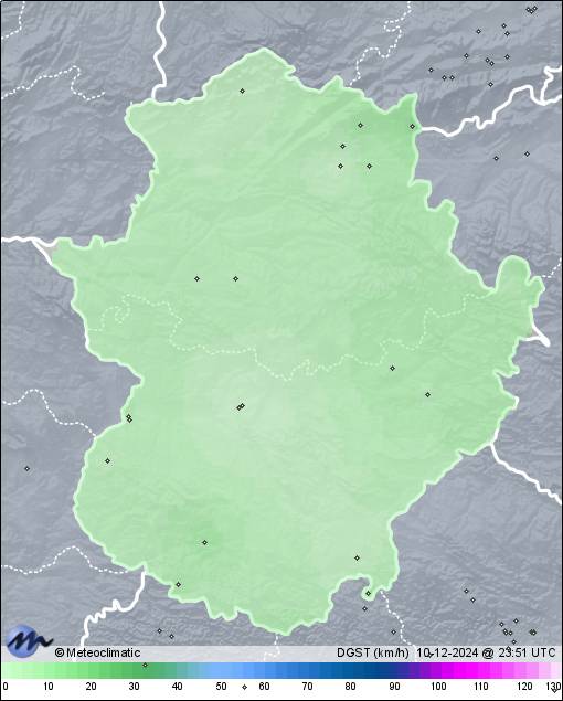 | 10-12-2024 | | | Máx. | Mín. | | | Temperatura | 13,9 | -1,3 | °C | | Humedad | 96 | 50 | % | | Viento | 9 | n/a | km/h | | Presión | 1.025 | 1.019 | hPa | | Precipitación | 0,0 | mm |