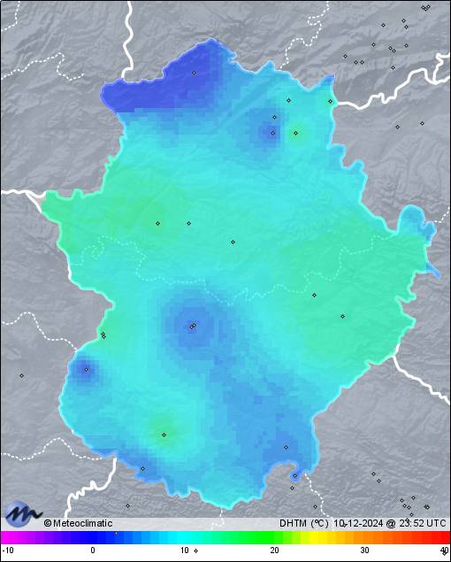 | 10-12-2024 | | | Máx. | Mín. | | | Temperatura | 12,5 | 1,8 | °C | | Humedad | 95 | 65 | % | | Viento | 9 | n/a | km/h | | Presión | 1.022 | 1.017 | hPa | | Precipitación | 0,0 | mm |