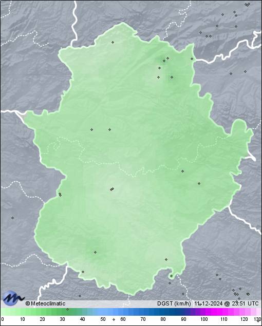 | 11-12-2024 | | | Máx. | Mín. | | | Temperatura | 11,9 | 0,2 | °C | | Humedad | 95 | 49 | % | | Viento | 22 | n/a | km/h | | Presión | 1.020 | 1.016 | hPa | | Precipitación | 0,0 | mm |