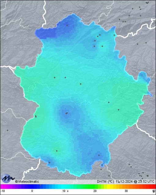 | 11-12-2024 | | | Máx. | Mín. | | | Temperatura | 12,6 | -1,2 | °C | | Humedad | 97 | 56 | % | | Viento | 11 | n/a | km/h | | Presión | 1.022 | 1.018 | hPa | | Precipitación | 0,0 | mm |