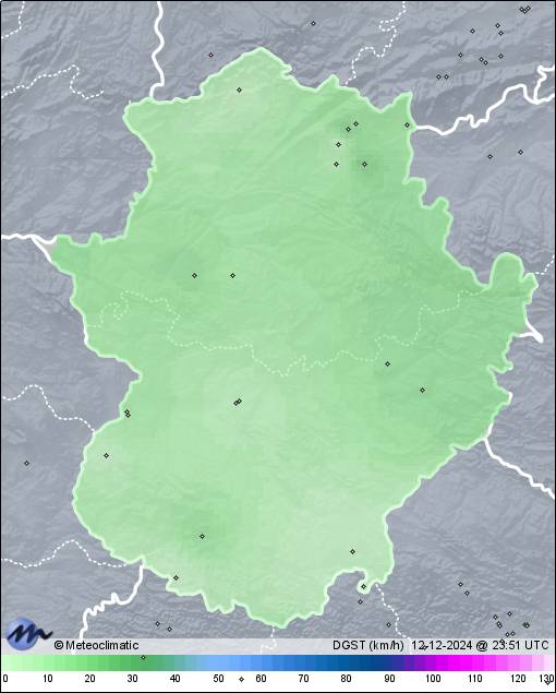 | 12-12-2024 | | | Máx. | Mín. | | | Temperatura | 12,5 | 2,4 | °C | | Humedad | 85 | 55 | % | | Viento | 26 | n/a | km/h | | Presión | 1.020 | 1.016 | hPa | | Precipitación | 0,8 | mm |