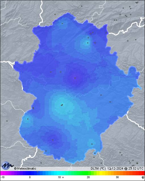 | 12-12-2024 | | | Máx. | Mín. | | | Temperatura | 11,8 | -2,4 | °C | | Humedad | 96 | 54 | % | | Viento | 10 | n/a | km/h | | Presión | 1.022 | 1.018 | hPa | | Precipitación | 0,2 | mm |