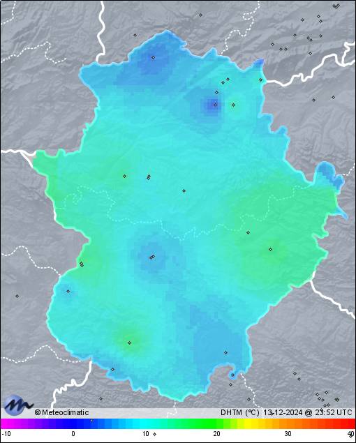 | 13-12-2024 | | | Máx. | Mín. | | | Temperatura | 13,8 | 5,7 | °C | | Humedad | 97 | 67 | % | | Viento | 11 | n/a | km/h | | Presión | 1.030 | 1.021 | hPa | | Precipitación | 0,0 | mm |