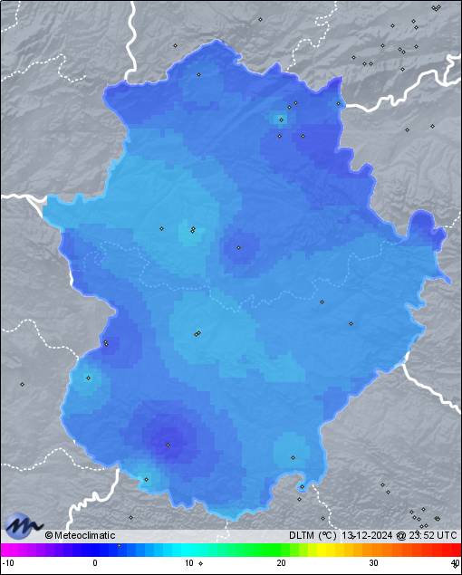 | 13-12-2024 | | | Máx. | Mín. | | | Temperatura | 13,8 | 5,7 | °C | | Humedad | 97 | 67 | % | | Viento | 11 | n/a | km/h | | Presión | 1.030 | 1.021 | hPa | | Precipitación | 0,0 | mm |