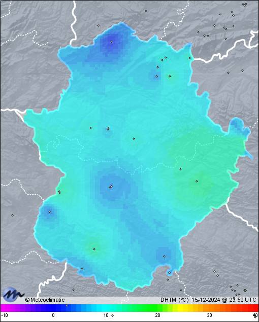 | 15-12-2024 | | | Máx. | Mín. | | | Temperatura | 10,3 | 0,8 | °C | | Humedad | 84 | 58 | % | | Viento | 9 | n/a | km/h | | Presión | 1.043 | 1.037 | hPa |