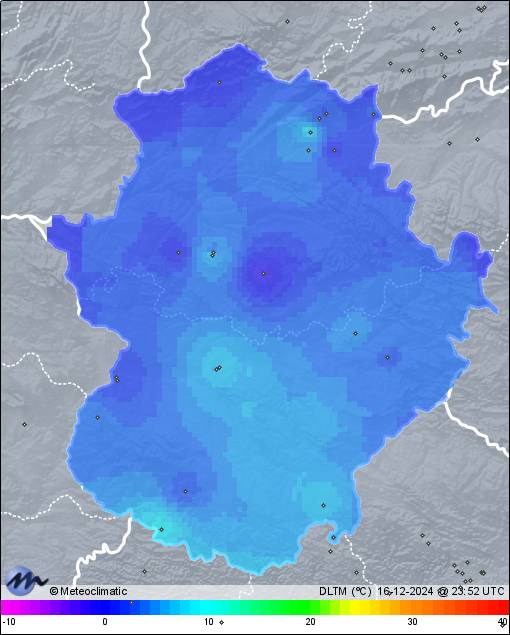 | 16-12-2024 | | | Máx. | Mín. | | | Temperatura | 13,0 | 0,6 | °C | | Humedad | 96 | 57 | % | | Viento | 35 | n/a | km/h | | Presión | 1.040 | 1.034 | hPa | | Precipitación | 0,0 | mm |