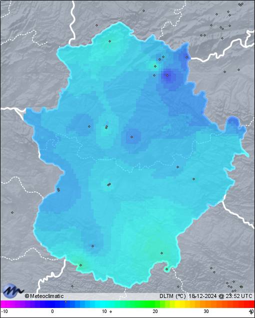 | 18-12-2024 | | | Máx. | Mín. | | | Temperatura | 13,9 | 1,4 | °C | | Humedad | 95 | 65 | % | | Viento | 13 | n/a | km/h | | Presión | 1.034 | 1.028 | hPa | | Precipitación | 0,0 | mm |