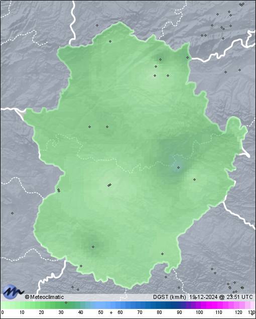 | 19-12-2024 | | | Máx. | Mín. | | | Temperatura | 15,8 | 6,6 | °C | | Humedad | 95 | 50 | % | | Viento | 32 | n/a | km/h | | Presión | 1.030 | 1.024 | hPa | | Precipitación | 4,2 | mm |