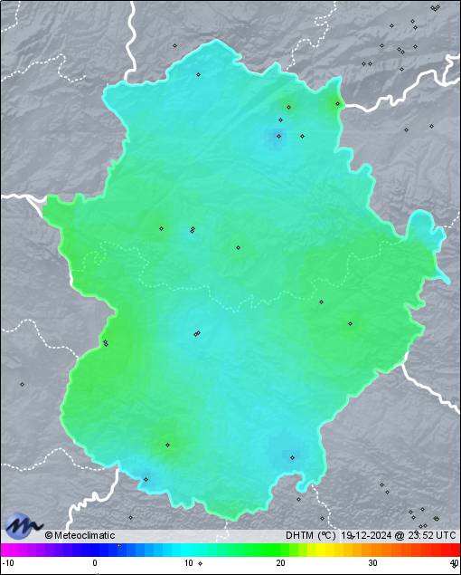 | 19-12-2024 | | | Máx. | Mín. | | | Temperatura | 15,8 | 6,6 | °C | | Humedad | 95 | 50 | % | | Viento | 32 | n/a | km/h | | Presión | 1.030 | 1.024 | hPa | | Precipitación | 4,2 | mm |