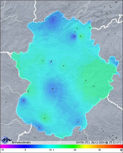 | 20-12-2024 | | | Máx. | Mín. | | | Temperatura | 13,5 | 4,4 | °C | | Humedad | 96 | 46 | % | | Viento | 15 | n/a | km/h | | Presión | 1.030 | 1.026 | hPa | | Precipitación | 0,0 | mm |