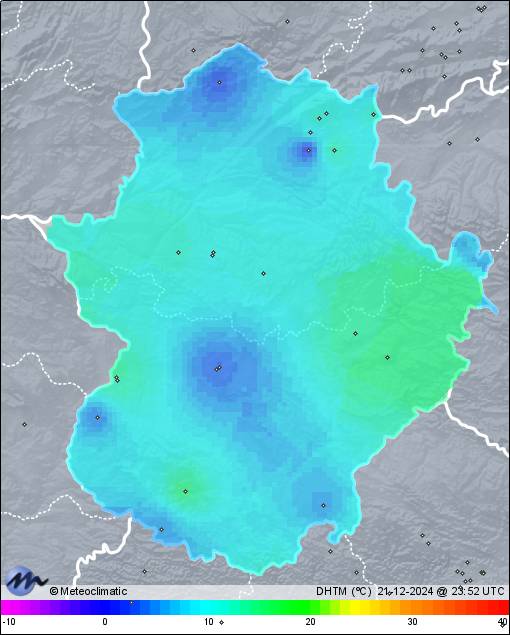 | 21-12-2024 | | | Máx. | Mín. | | | Temperatura | 13,4 | -2,9 | °C | | Humedad | 97 | 51 | % | | Viento | 15 | n/a | km/h | | Presión | 1.036 | 1.031 | hPa | | Precipitación | 0,0 | mm |