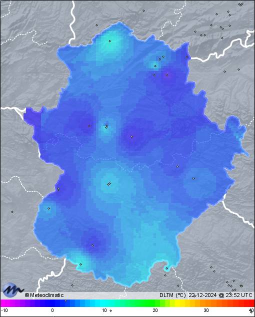 | 22-12-2024 | | | Máx. | Mín. | | | Temperatura | 12,9 | -2,8 | °C | | Humedad | 98 | 57 | % | | Viento | 11 | n/a | km/h | | Presión | 1.036 | 1.027 | hPa | | Precipitación | 0,0 | mm |