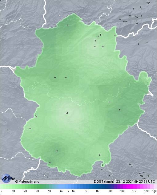 | 23-12-2024 | | | Máx. | Mín. | | | Temperatura | 15,7 | 3,5 | °C | | Humedad | 96 | 34 | % | | Viento | 37 | n/a | km/h | | Precipitación | 0,0 | mm |