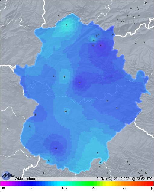 | 23-12-2024 | | | Máx. | Mín. | | | Temperatura | 15,7 | 3,5 | °C | | Humedad | 96 | 34 | % | | Viento | 37 | n/a | km/h | | Precipitación | 0,0 | mm |