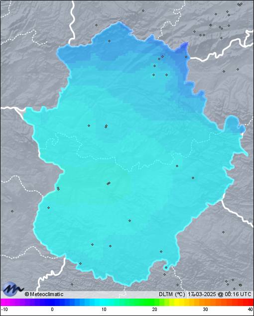 | 16-03-2025 | | | Máx. | Mín. | | | Temperatura | 15,7 | 6,8 | °C | | Humedad | 98 | 55 | % | | Viento | 22 | n/a | km/h | | Precipitación | 11,7 | mm |