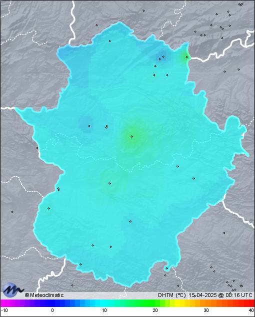 | 14-04-2025 | | | Máx. | Mín. | | | Temperatura | 16,7 | 9,9 | °C | | Humedad | 91 | 56 | % | | Viento | 35 | n/a | km/h | | Presión | 1.011 | 1.006 | hPa | | Precipitación | 13,8 | mm |