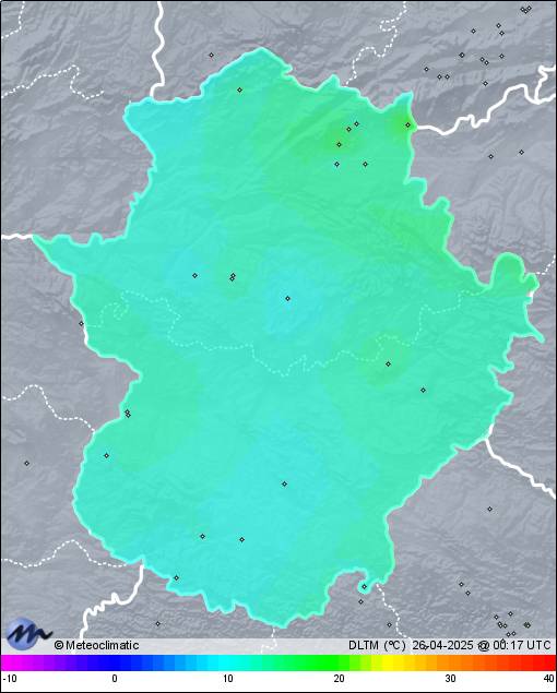 | 25-04-2025 | | | Máx. | Mín. | | | Temperatura | 28,9 | 13,0 | °C | | Humedad | 92 | 42 | % | | Viento | 17 | n/a | km/h | | Presión | 1.019 | 1.013 | hPa | | Precipitación | 0,0 | mm |