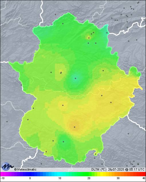 | 25-07-2025 | | | Máx. | Mín. | | | Temperatura | 36,0 | 20,9 | °C | | Humedad | 66 | 18 | % | | Viento | 39 | n/a | km/h | | Precipitación | 0,0 | mm |