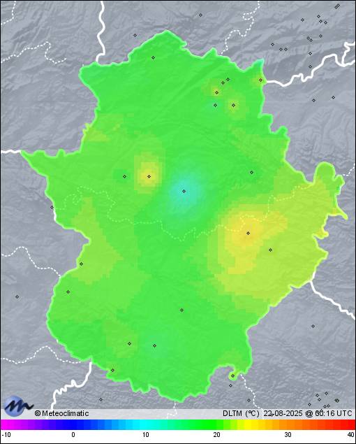 | 21-08-2025 | | | Máx. | Mín. | | | Temperatura | 32,0 | 15,8 | °C | | Humedad | 87 | 25 | % | | Viento | 18 | n/a | km/h | | Presión | 1.014 | 1.011 | hPa | | Precipitación | 0,0 | mm |