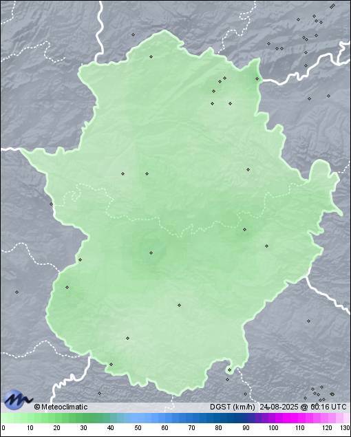 | 23-08-2025 | | | Máx. | Mín. | | | Temperatura | 33,0 | 17,7 | °C | | Humedad | 60 | 18 | % | | Viento | 34 | n/a | km/h | | Presión | 1.017 | 1.014 | hPa | | Precipitación | 0,0 | mm |
