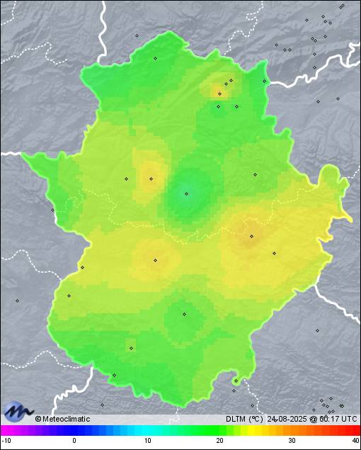 | 23-08-2025 | | | Máx. | Mín. | | | Temperatura | 37,1 | 14,6 | °C | | Humedad | 91 | 22 | % | | Viento | 24 | n/a | km/h | | Presión | 1.015 | 1.010 | hPa | | Precipitación | 0,0 | mm |