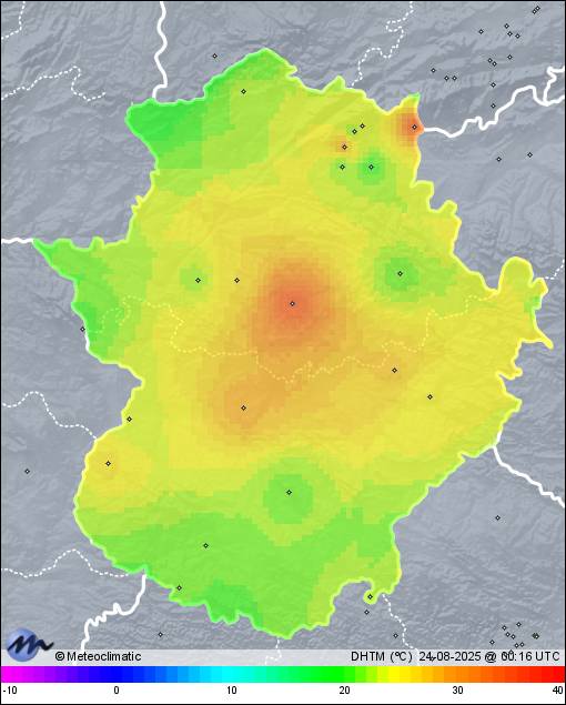 | 23-08-2025 | | | Máx. | Mín. | | | Temperatura | 37,1 | 14,6 | °C | | Humedad | 91 | 22 | % | | Viento | 24 | n/a | km/h | | Presión | 1.015 | 1.010 | hPa | | Precipitación | 0,0 | mm |