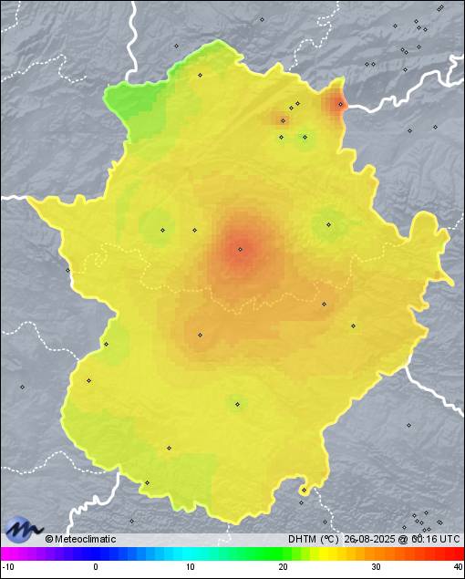 | 25-08-2025 | | | Máx. | Mín. | | | Temperatura | 36,3 | 18,7 | °C | | Humedad | 63 | 28 | % | | Viento | 22 | n/a | km/h | | Presión | 1.011 | 1.007 | hPa | | Precipitación | 0,0 | mm |