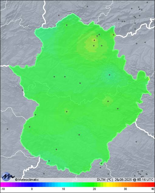 | 27-08-2025 | | | Máx. | Mín. | | | Temperatura | 29,9 | 15,4 | °C | | Humedad | 85 | 26 | % | | Viento | 31 | n/a | km/h | | Presión | 1.013 | 1.009 | hPa | | Precipitación | 0,0 | mm |