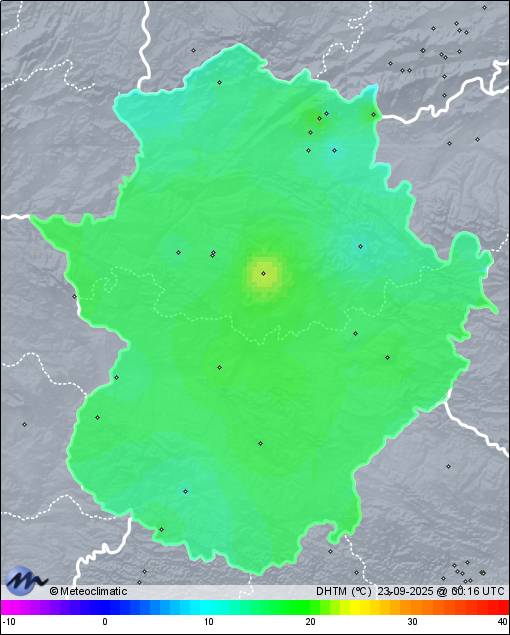 | 22-09-2025 | | | Máx. | Mín. | | | Temperatura | 21,5 | 7,8 | °C | | Humedad | 69 | 30 | % | | Viento | 24 | n/a | km/h | | Presión | 1.022 | 1.017 | hPa | | Precipitación | x | mm |