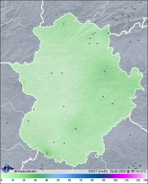 | 24-09-2025 | | | Máx. | Mín. | | | Temperatura | 26,1 | 10,3 | °C | | Humedad | 82 | 24 | % | | Viento | 31 | n/a | km/h | | Presión | 1.022 | 1.016 | hPa | | Precipitación | 0,0 | mm |